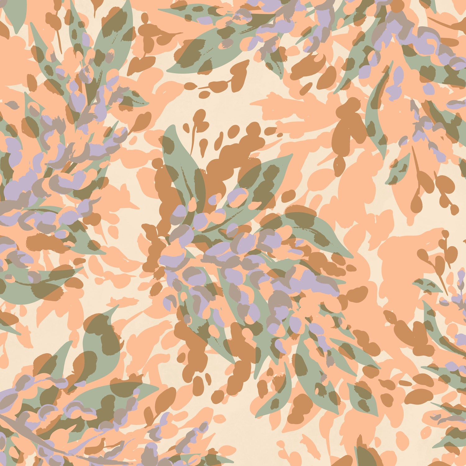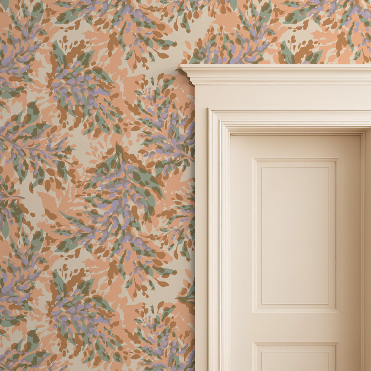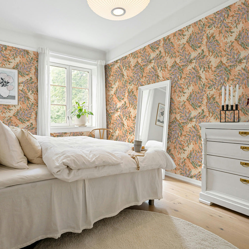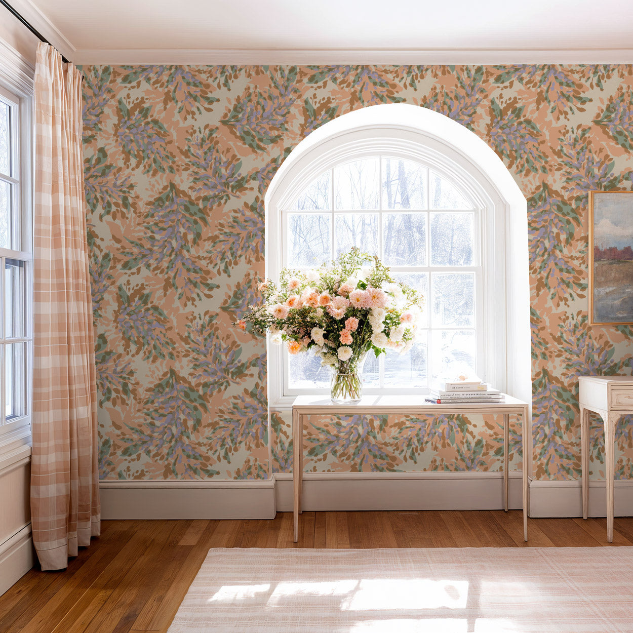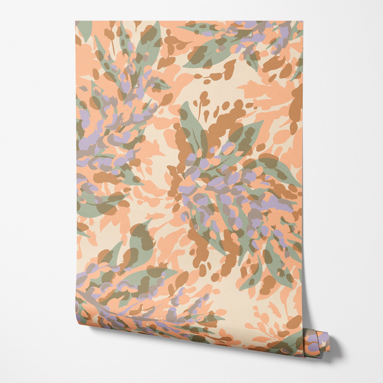 This wallpaper features a painterly array of leaves and buds, softly layered to create a dappled, ethereal effect. Fluid organic forms float as if sunlight is filtering through a lush canopy. A perfect blend of modern artistry and natural serenity for any interior.