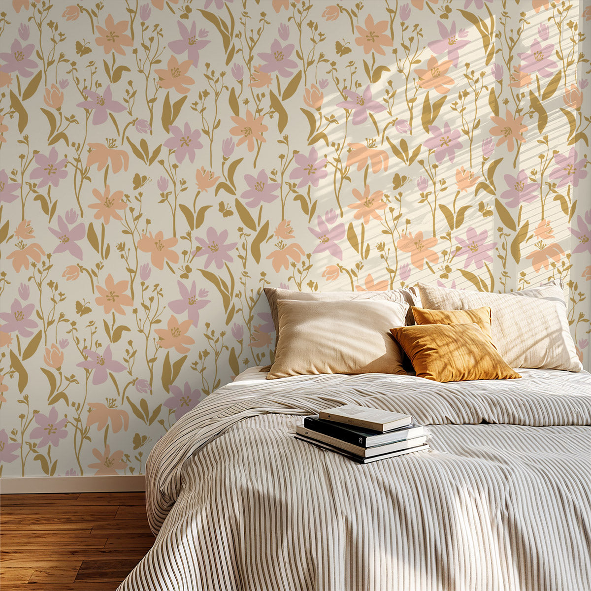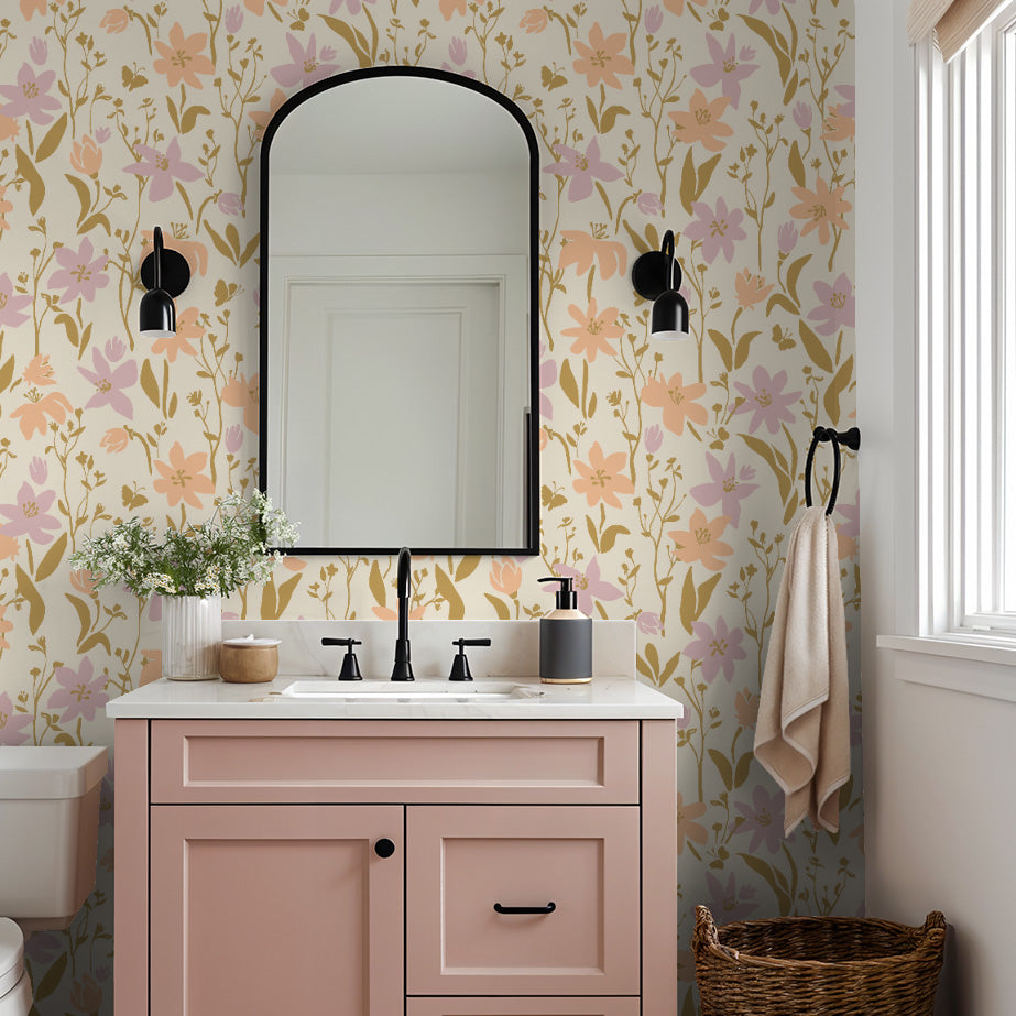 Expressive flowers with whimsical, artsy stems and delicate butterflies bloom in dreamy shades of peach and pink. The soft, romantic palette creates a serene atmosphere, blending modern elegance with boho and cottage charm. Perfect for adding a gentle, artistic touch to any space.