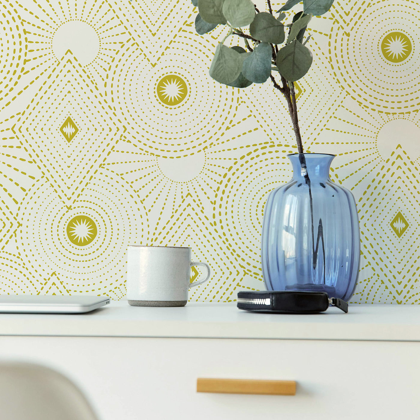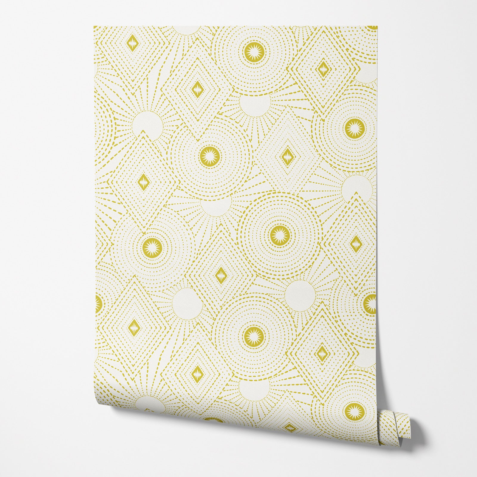 This modern retro wallpaper features a striking sun-inspired design made from dotted lines, overlapping concentric diamonds, circles, and radiant sunbursts. The geometric layering creates a sense of rhythm and movement, blending vintage flair with contemporary edge. Cool and graphic, this pattern adds bold personality and visual texture to any space.
