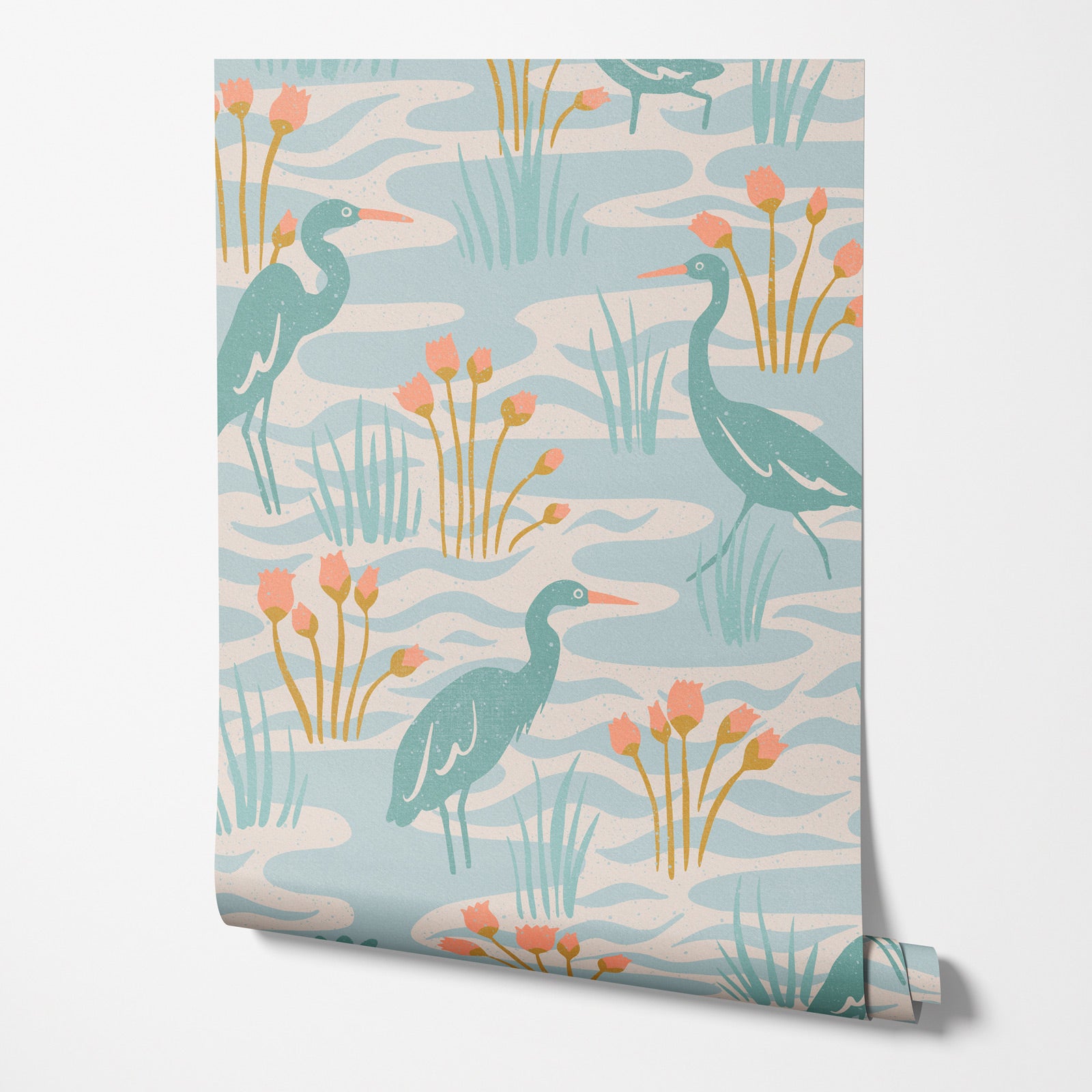 Herons mingle in this whimsical lagoon filled with dancing grasses and cheerful blooms. Set in a dreamy palette of soft blue with touches of peach, it feels like a storybook scene come to life. Perfect for nurseries or airy coastal homes, it brings a breeze of joy and a splash of charm to any space.