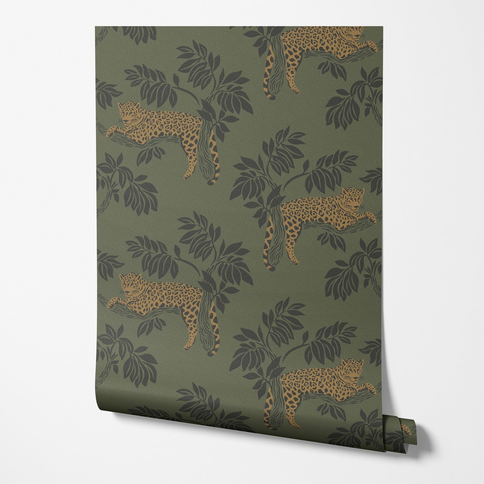 Tap into your wild side with this striking wallpaper that captures jaguars lounging gracefully among tree branches. Set against a deep, moody jungle green background, the scene feels both mysterious and serene. It's a bold yet calming design that brings an alluring sense of adventure to any room.