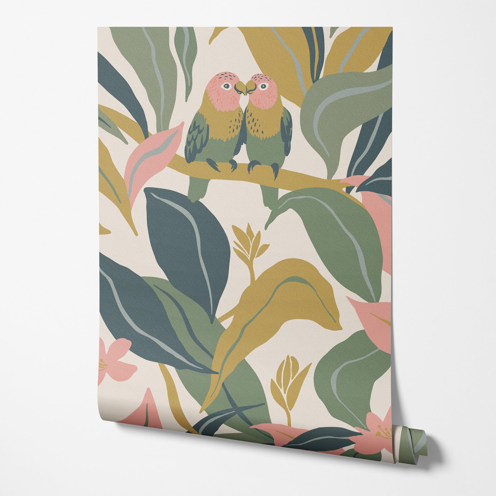 Immerse your space in a romantic jungle dreamscape with this modern artistic wallpaper. Love birds perch happily amid lush, oversized tropical leaves, while hues of sage green, olive and blush pink create a serene, enchanted ambiance—perfect for bringing a touch of modern tropical to any room.