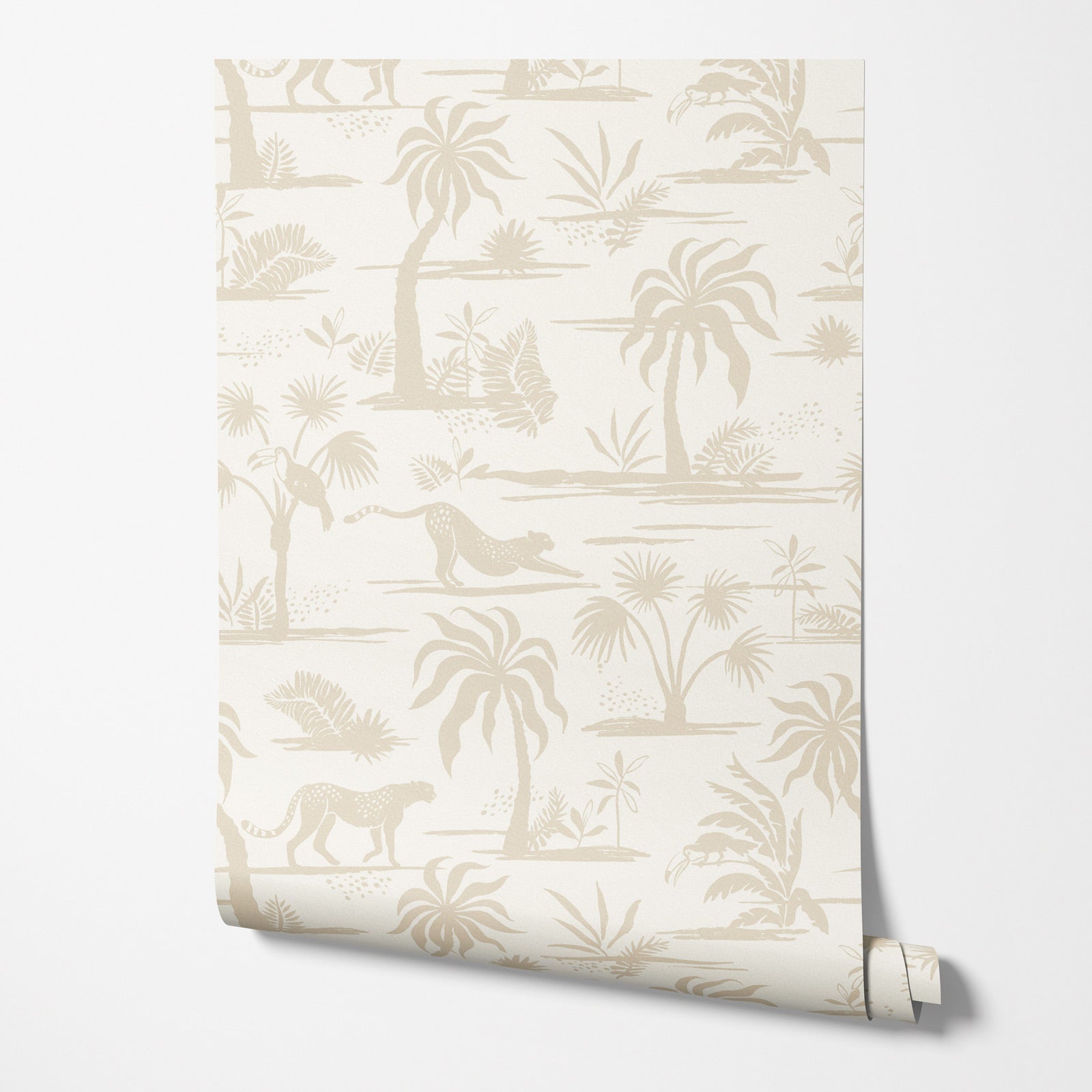 This charming wallpaper features leopards lounging and toucans perched playfully among palm trees and lush tropical foliage, all in a soft beige-on-cream palette. The gentle tones keep things elegant, while the whimsical scene adds a wink of personality. It’s a subtle yet spirited design that invites a closer look.