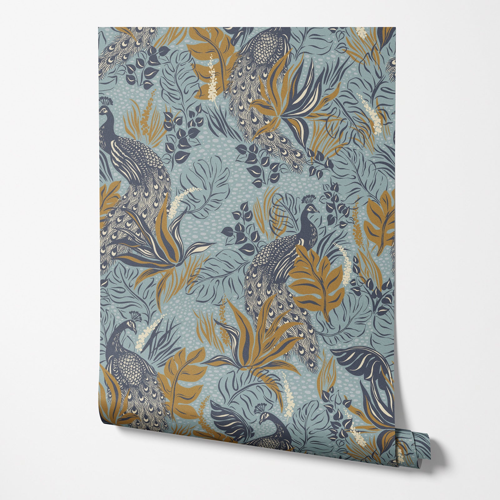 Crafted to showcase majestic peacocks nestled among exotic foliage, this peacock wallpaper brings a sense of luxury and natural beauty to any space. With serene, cool shades of blue and a subtle pebble-like texture it adds depth and a refined tactile quality to your walls.