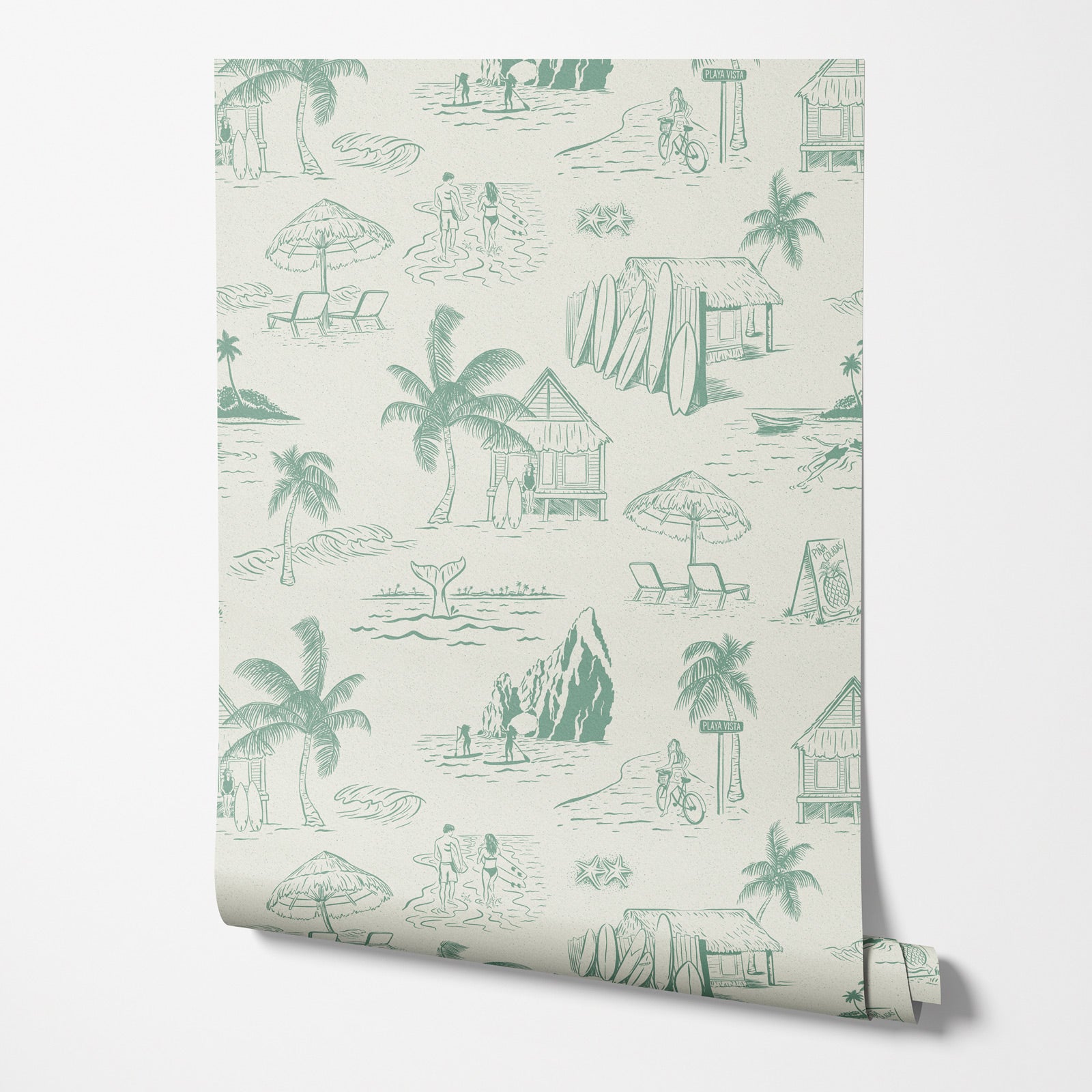 This toile-inspired wallpaper captures the laid-back spirit of Mexico’s coast with hand-drawn scenes of surfing, stand-up paddle boarding, whale watching, and floating in tropical waters. From biking under the palm trees to spotting marine life offshore, each vignette brings a sense of sun-soaked adventure. Timeless and playful, this design blends classic toile elegance with the warmth of beachside paradise.