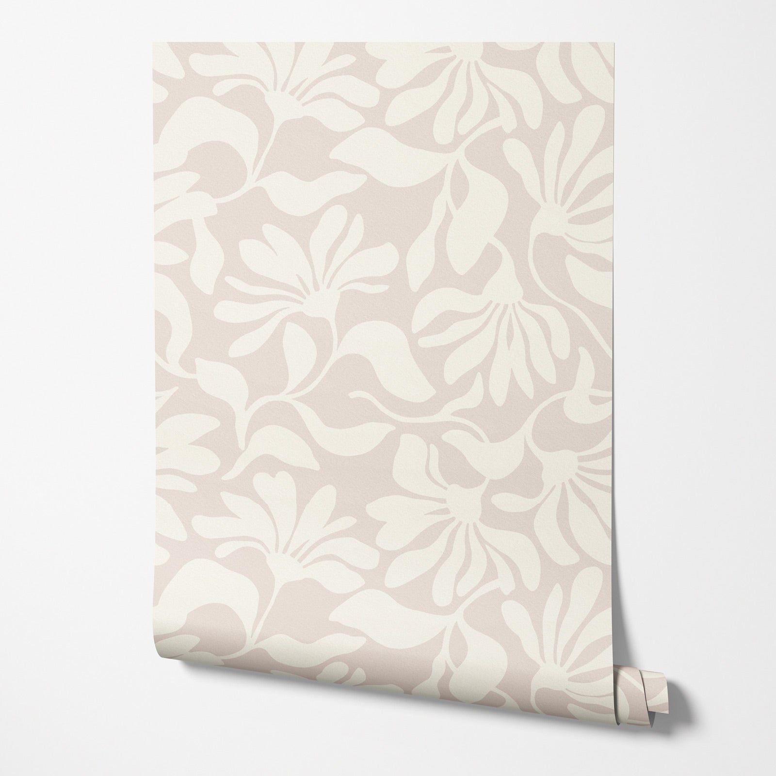 This wallpaper showcases a bold, minimalist floral motif rendered in a soft cream tone, standing out elegantly against a warm taupe background. The clean lines and oversized blooms offer a refined balance of modern simplicity and organic charm. Perfect for adding understated sophistication to both contemporary and classic spaces.