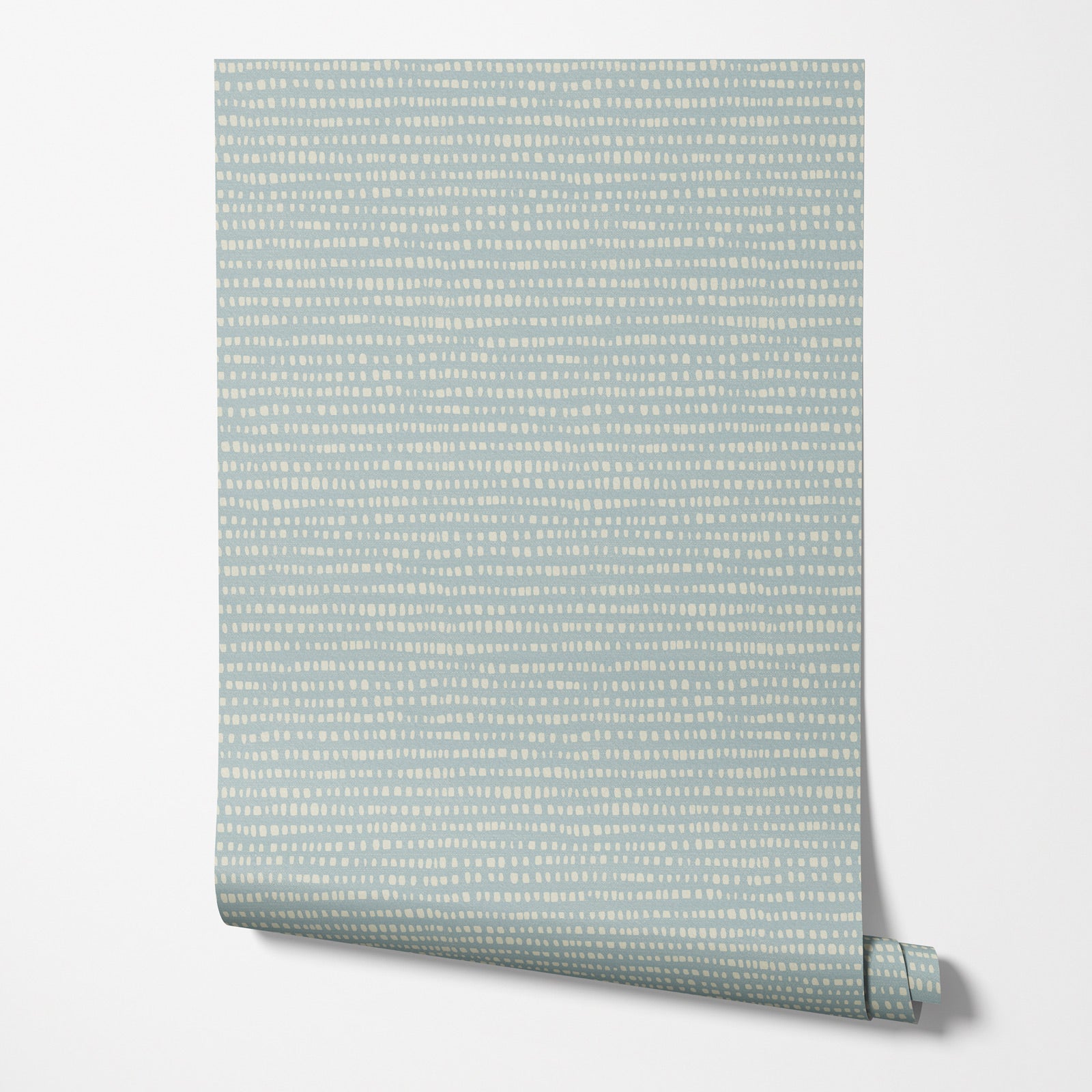 This soft blue wallpaper blends the organic warmth of grasscloth with a refined horizontal dot pattern and subtle linen texture, creating a calming, elevated look. The layered design adds quiet rhythm and dimension while remaining understated and versatile. Perfect for coastal homes and relaxed, sophisticated interiors that embrace texture over bold pattern.