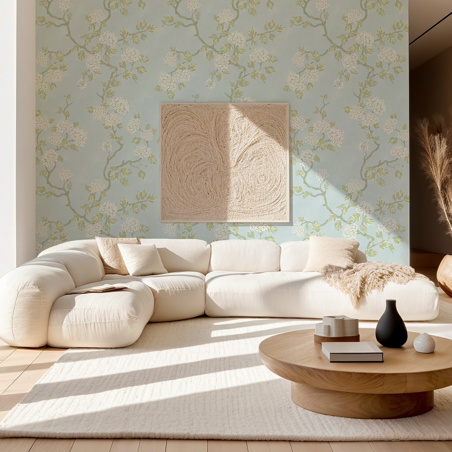Delicate white hydrangeas trail gracefully across a serene expanse of light blue, capturing the timeless charm of chinoiserie with a refreshing modern air. The floral vines drift weightlessly, creating a sense of movement and spaciousness that brightens any room. With its soft palette and painterly charm, this wallpaper brings a calm, airy beauty to your walls.