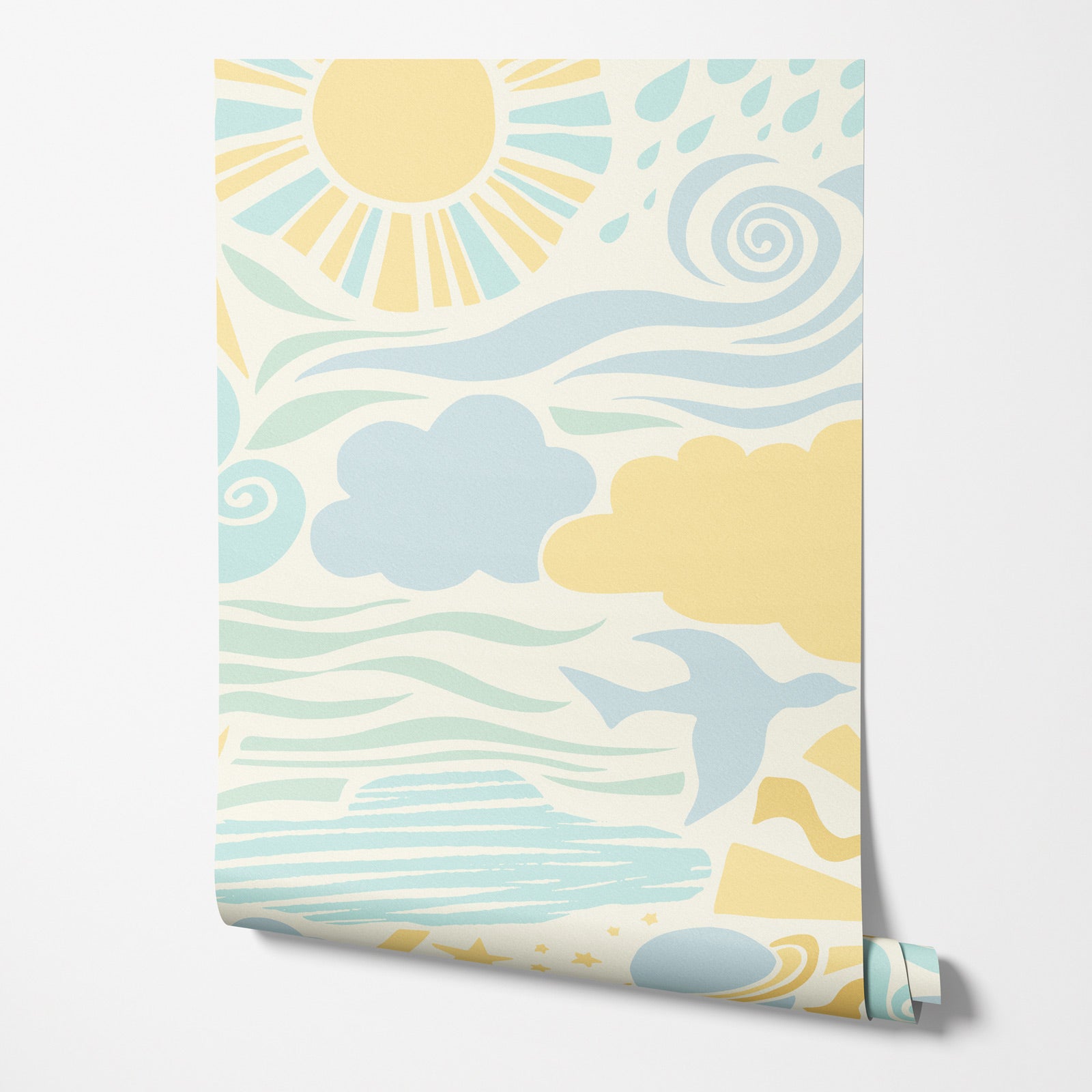 This whimsical wallpaper brings the wonder of the sky indoors with a joyful mix of suns, rainbows, clouds, stars, birds, planets, and more. Each dreamy detail appears in soft pastel tones of yellow and blue, creating a calming and imaginative atmosphere. Perfect for a nursery or kids room, it invites little ones to dream big and drift off under a magical sky.